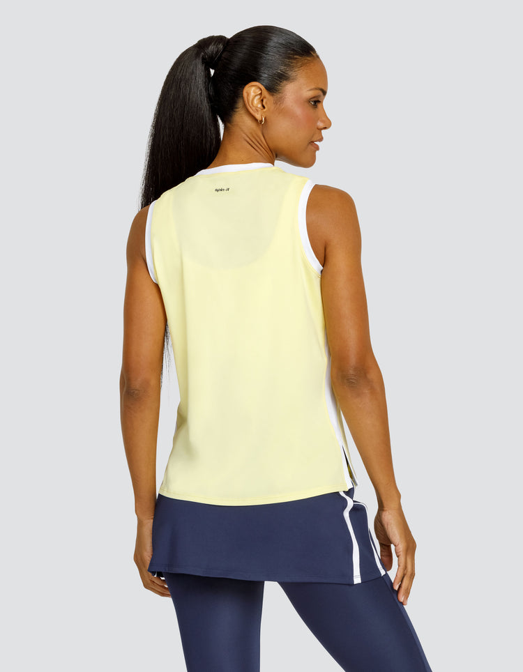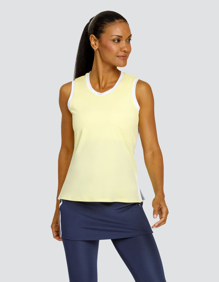 Cool contrast color details frame our Dink Tank for a flattering look. Featuring small side slits at the hem for comfort, it is made of our sleek, lightweight Bliss Jersey. A perfect match to our Dash skirt!